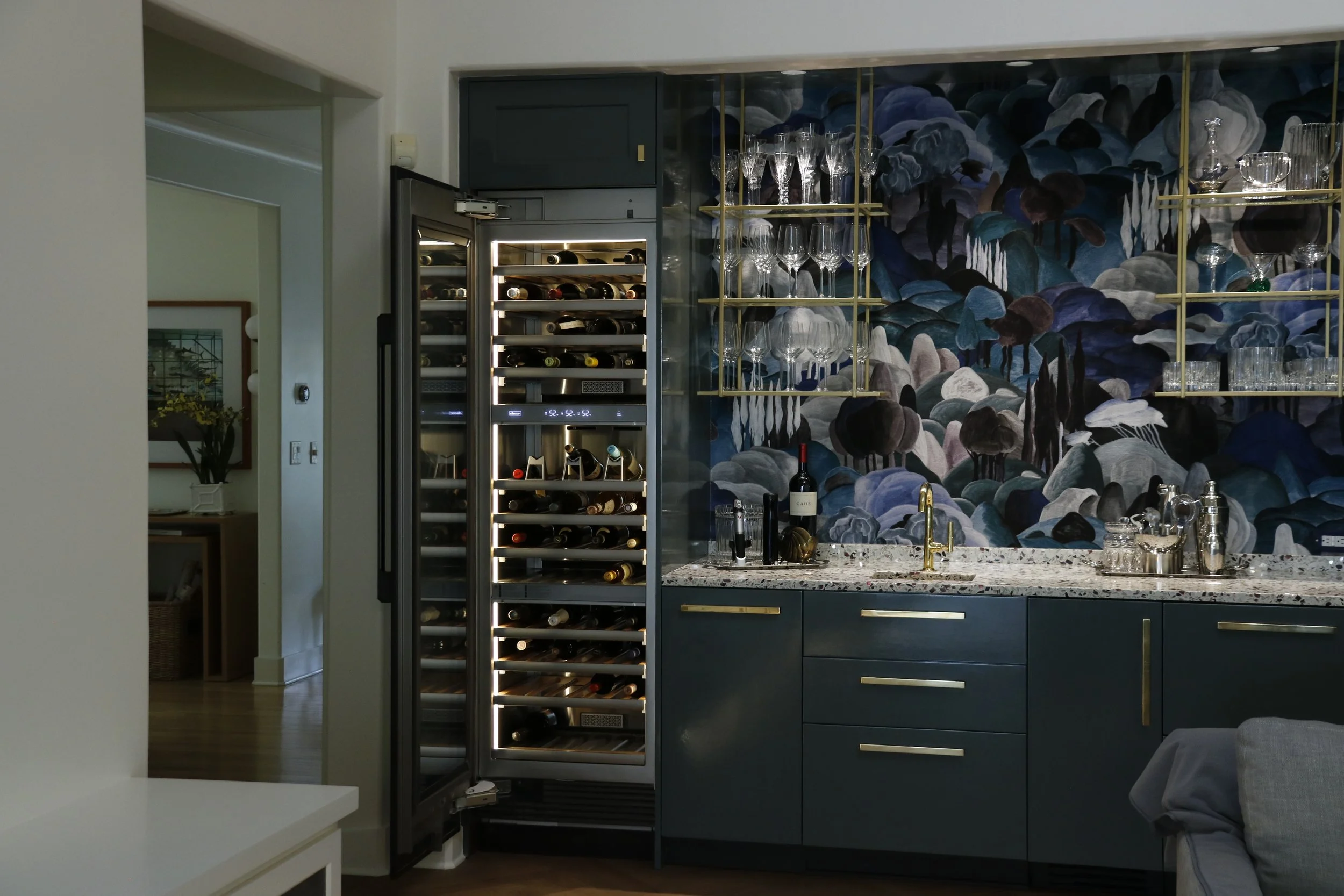 A highlight of the design is the imported Belgian wallpaper, adding rich texture, color and depth. The result is a timeless, sophisticated bar that blends beautifully with the home's overall aesthetic.